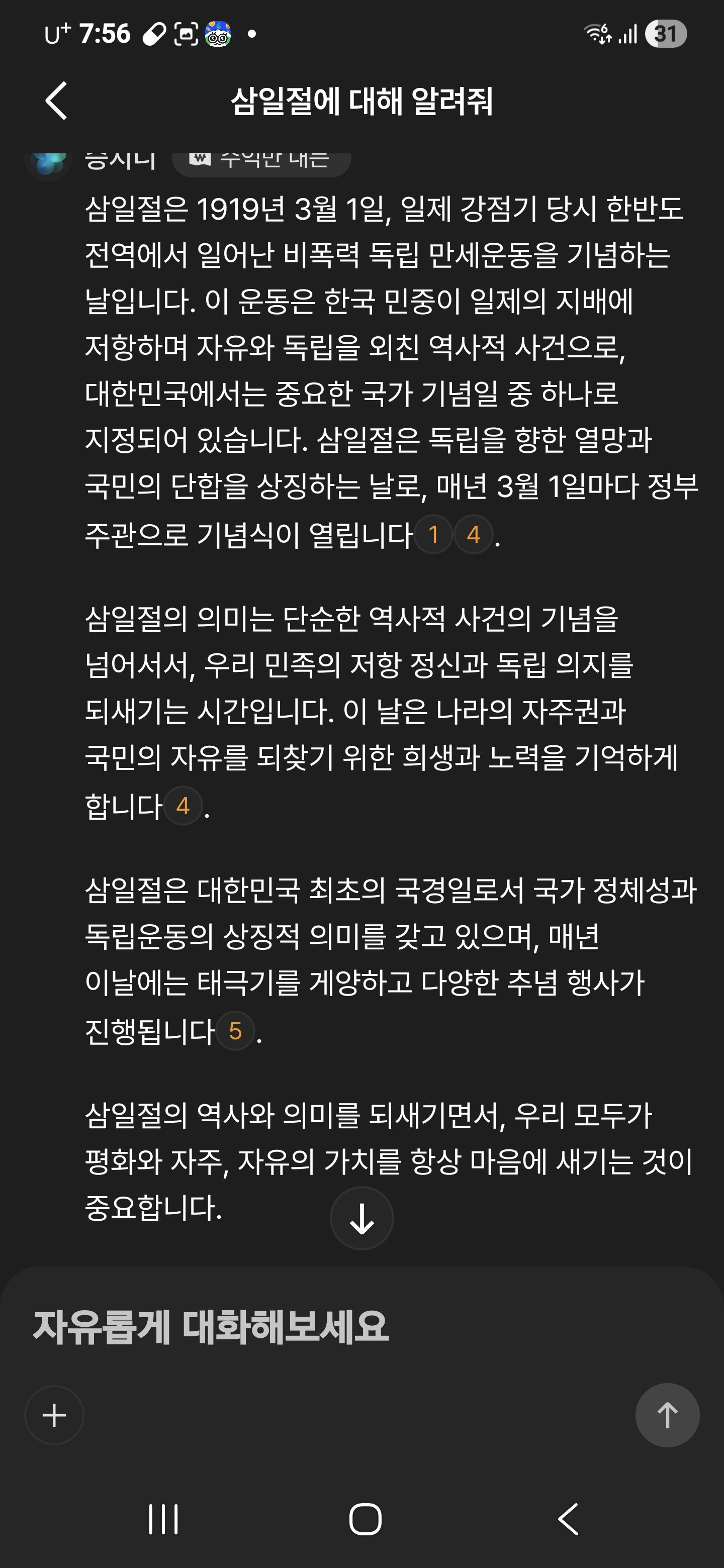 오늘은 3월1일 삼일절 정확한 의미를 AI에게 물어보고 다시금 그날의 정신을 생각하면 하루를 보냅니다. 태극기부터 게양해야 겠습니다.