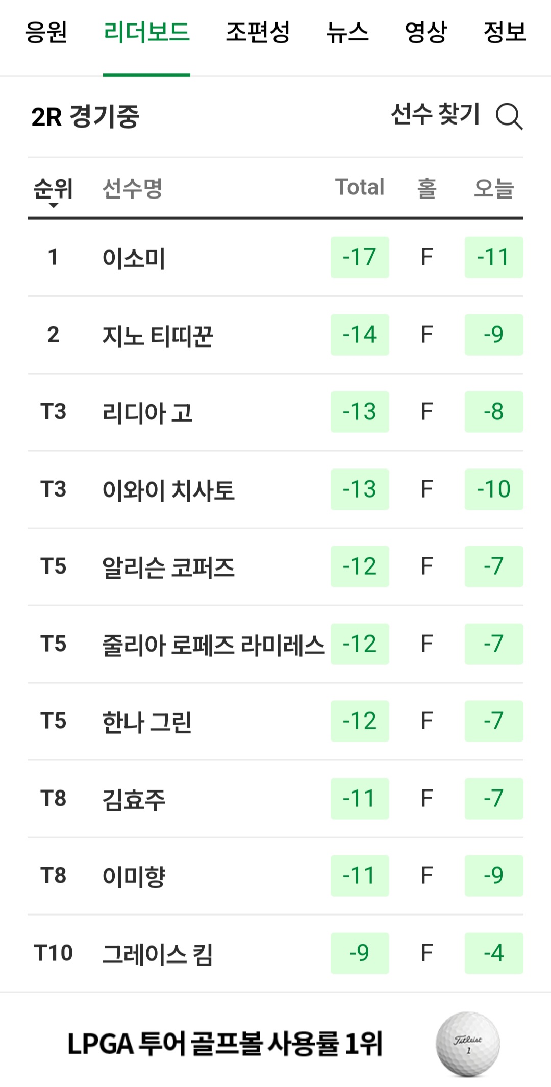 혼다 LPGA 타일랜드 2R 현재 이소미선수가 3타차 선두예요 제가 응원하는 선수중 한명이라 더 열심히 보게 되네요 끝까지 잘해서 꼭 우승했으면 좋겠어요