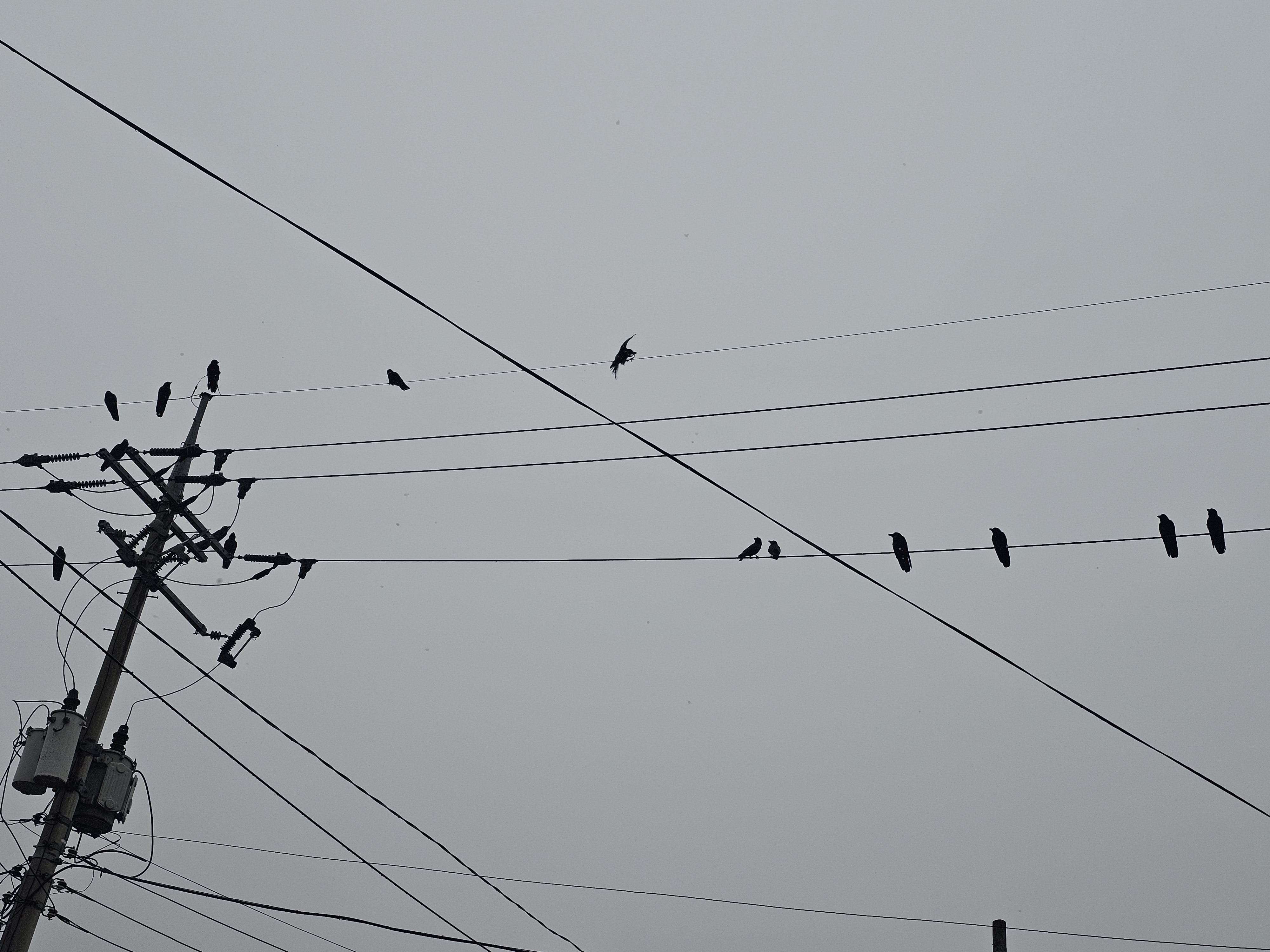 눈도 내리는데 까마귀들이 전깃줄에서 모임을 하고 있네요