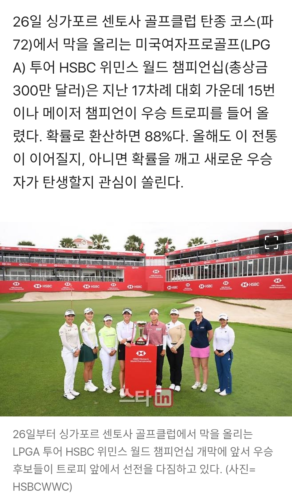 오늘부터 시작되는 HSBC 월드챔피언십에서 한국의 선수들이 그간 우승을 많이 해왔다네요^^ (HSBC 위민스 월드 챔피언십에서 그동안 17번의 우승자를 가렸고, 그 중 8차례는 한국인 우승이었다; 신지애(2009년), 박인비(2015, 2017년), 장하나(2016년), 박성현(2019년), 김효주(2021년), 고진영(2022, 2023년).) 이번에도 한국낭자들의 쾌거를 기원해봅니다🙏🙏