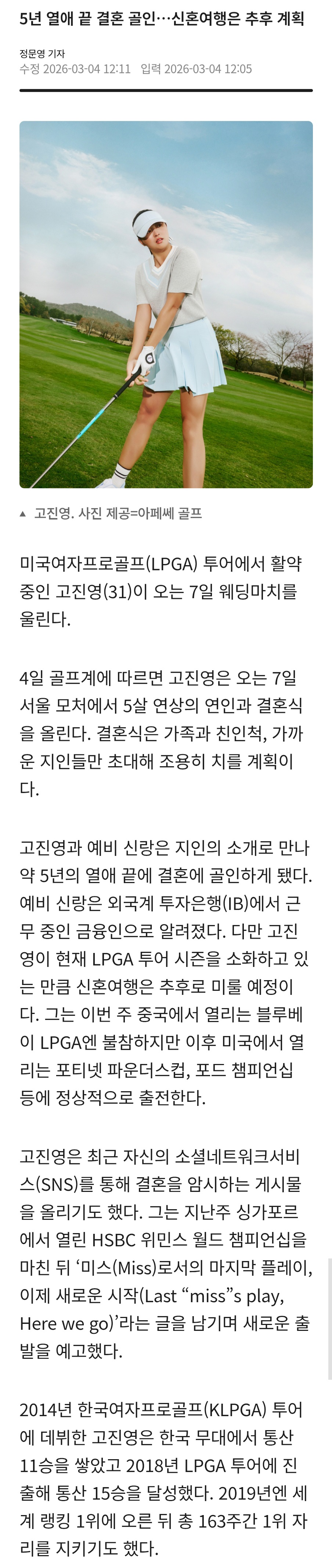 LPGA 고진영, 5살 연상 금융맨과 7일 웨딩마치