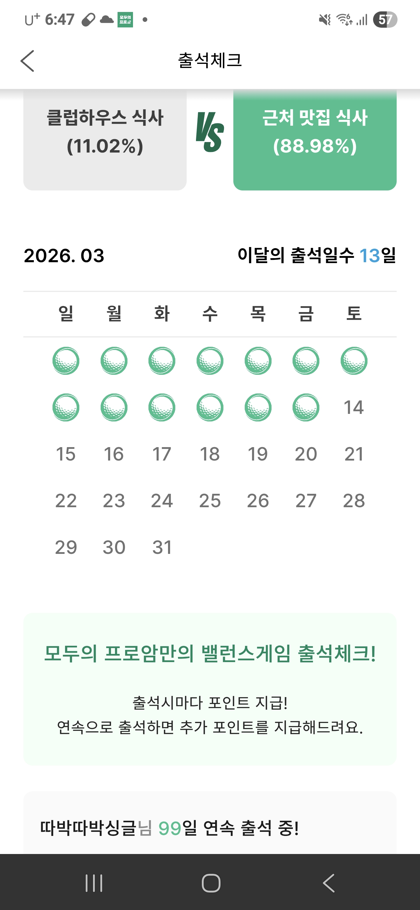 연속출석 99일 그늘집 너무 비싸요 ㅎㅎ 근처 맛집이 편하게 식사할수 있고 선택지가 넓어서 근처맛집