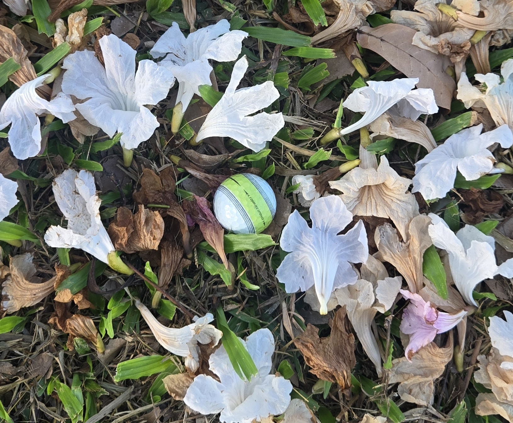 흰꽃 분홍꽃이 소복히 떨어져 있는 곳에 공이 들어가서 매번 공찾아 헤맸는데 오늘은 꽃들을 피해 잘 보이는곳에 딱 떨어져 있네요