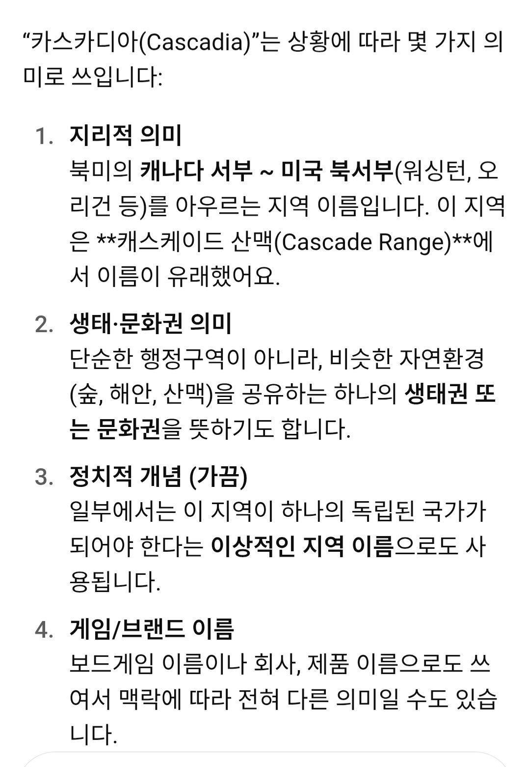 카스카디아 뜻이 뭔가 궁금해서 챗gtp에 물어보니 아래와같은 답변이 나오네요 1번,산맥이름을 의미하는 뜻 이지않을까 하네요.