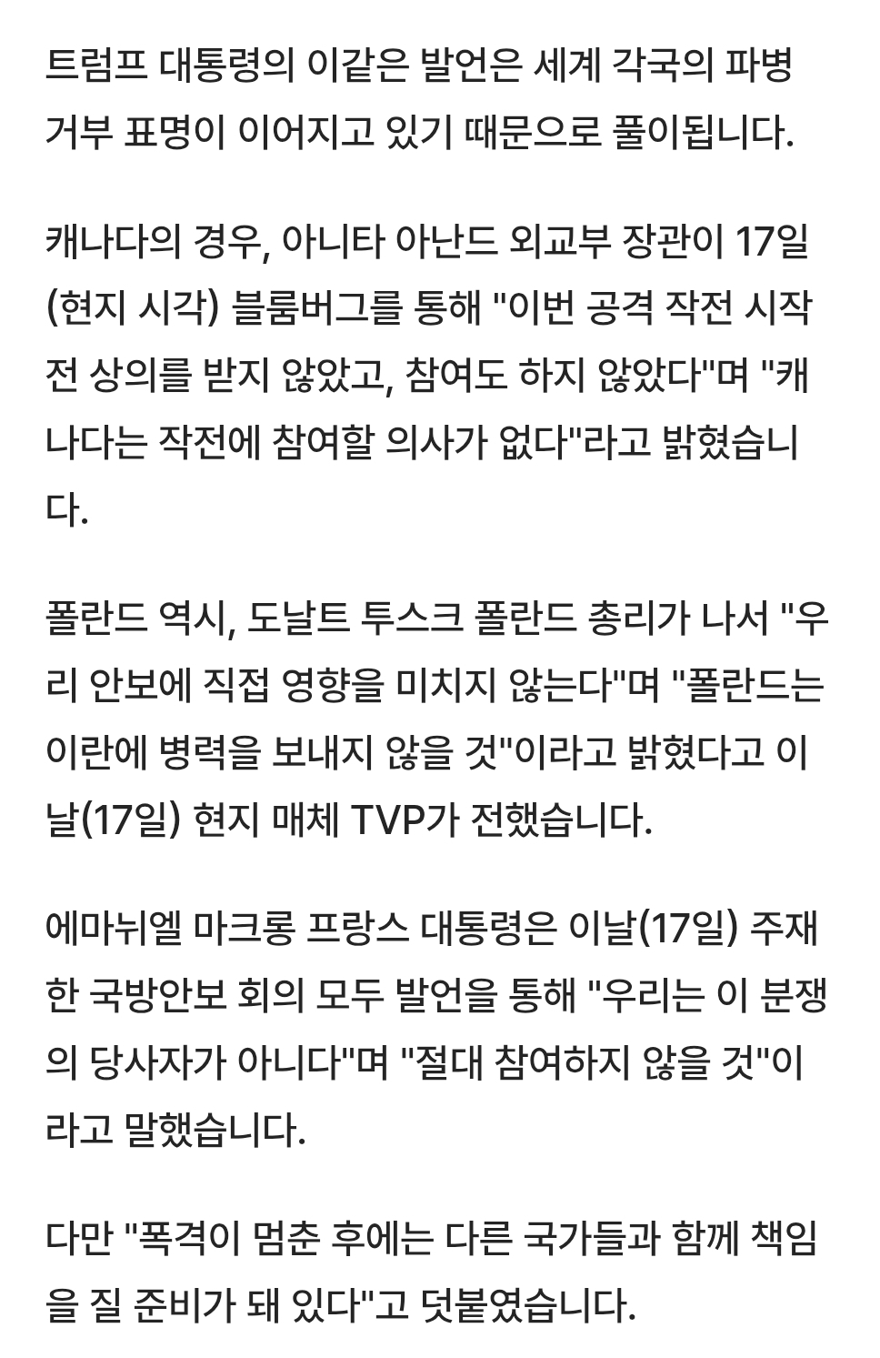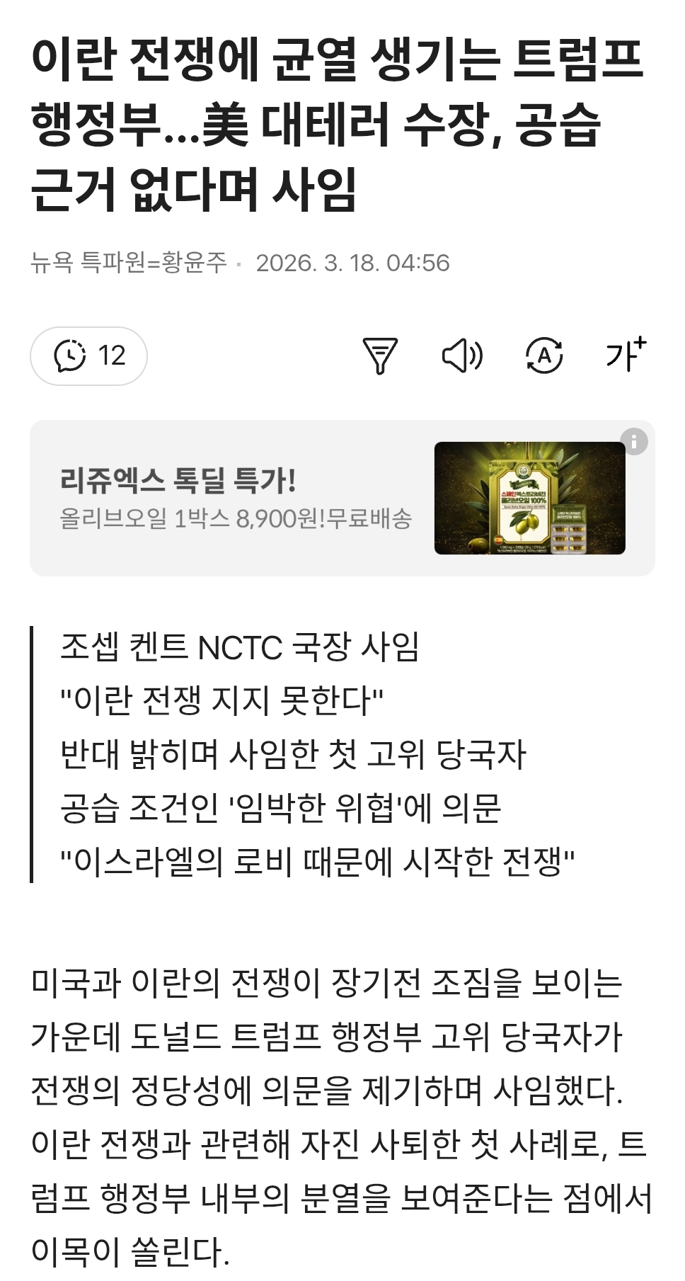 사임 소식이 알려졌네요. 나토 회원국을 포함한 캐나다도 이번 전쟁에 불참 의사를 분명히 하고들 있고... 도람프가 언제쯤 정신을 차릴랑가는 몰겠지만 수천명의 목숨을 앗아가는 전쟁을 본인이 임명한 고위관료에게도 수긍을 못받는다는건 큰 문제지 싶습니다 전쟁이 뭔 애들 장난도 아니고...