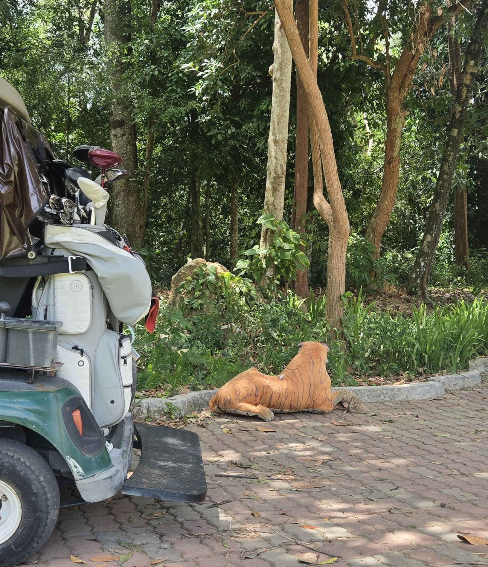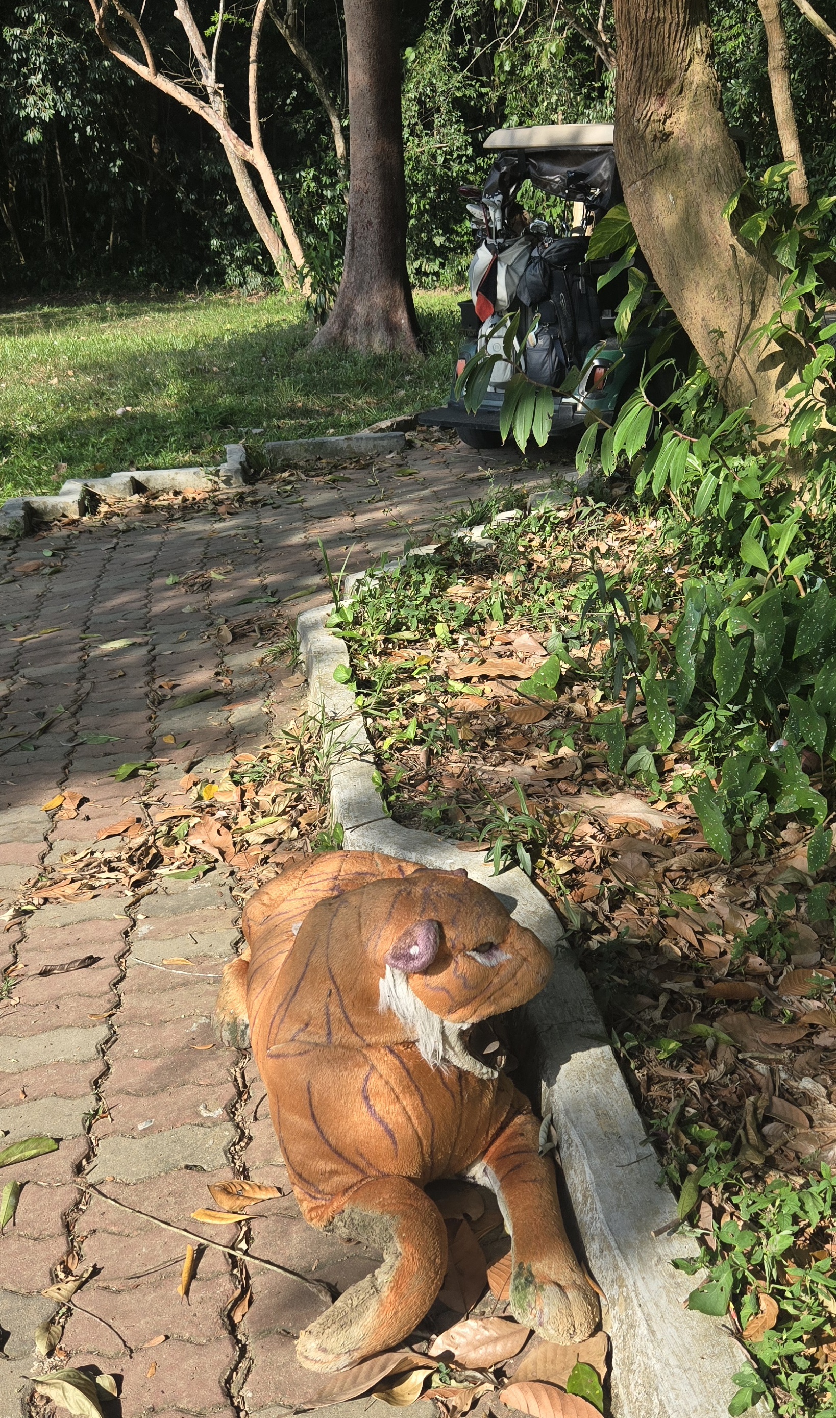 원숭이 출몰지역에 놓여진 호랑이 인형~ㅋㅋㅋ 그옆에 카트 세워봤지만 원숭이들 전혀 아랑곳않고 카트 습격함.