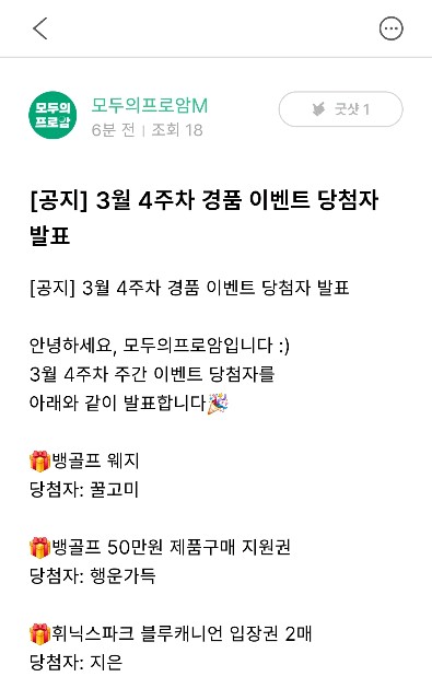 3월4주차 경품 이벤트 당첨 축하드립니다