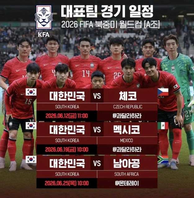 6월 월드컵 조가 최종 확정!!!대한민국은 체코, 멕시코, 남아공~~근데... 조가 문제는 아니죠 😢암튼 응원합니당~~~ 이젠 실전이당!!죄다 평일 목, 금 오전... 어서 짱박혀 봐야하낭...06.12(금) 11시, vs 체코06.19(금) 10시, vs 멕시코06.25(목) 10시, vs 남아공