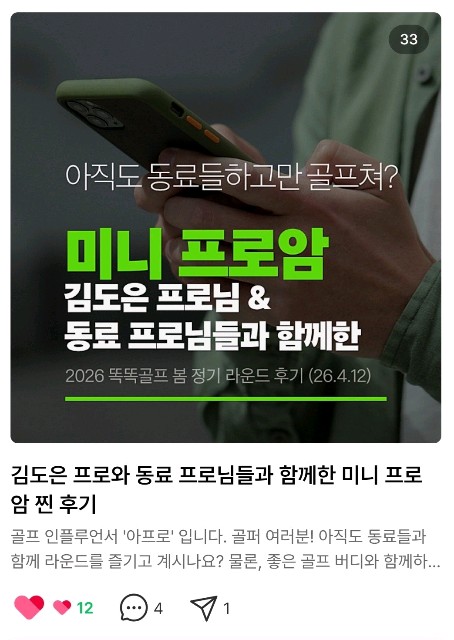 김도은 프로님이 본인의 인맥을 활용하여진행했던 미니프로암 후기입니다. 참가자들은 본인의 비용을 부담하고프로와 라운드를 함께 즐긴 하루였어요.자세한 내용은 링크로...https://m.blog.naver.com/william_korea/224250318266