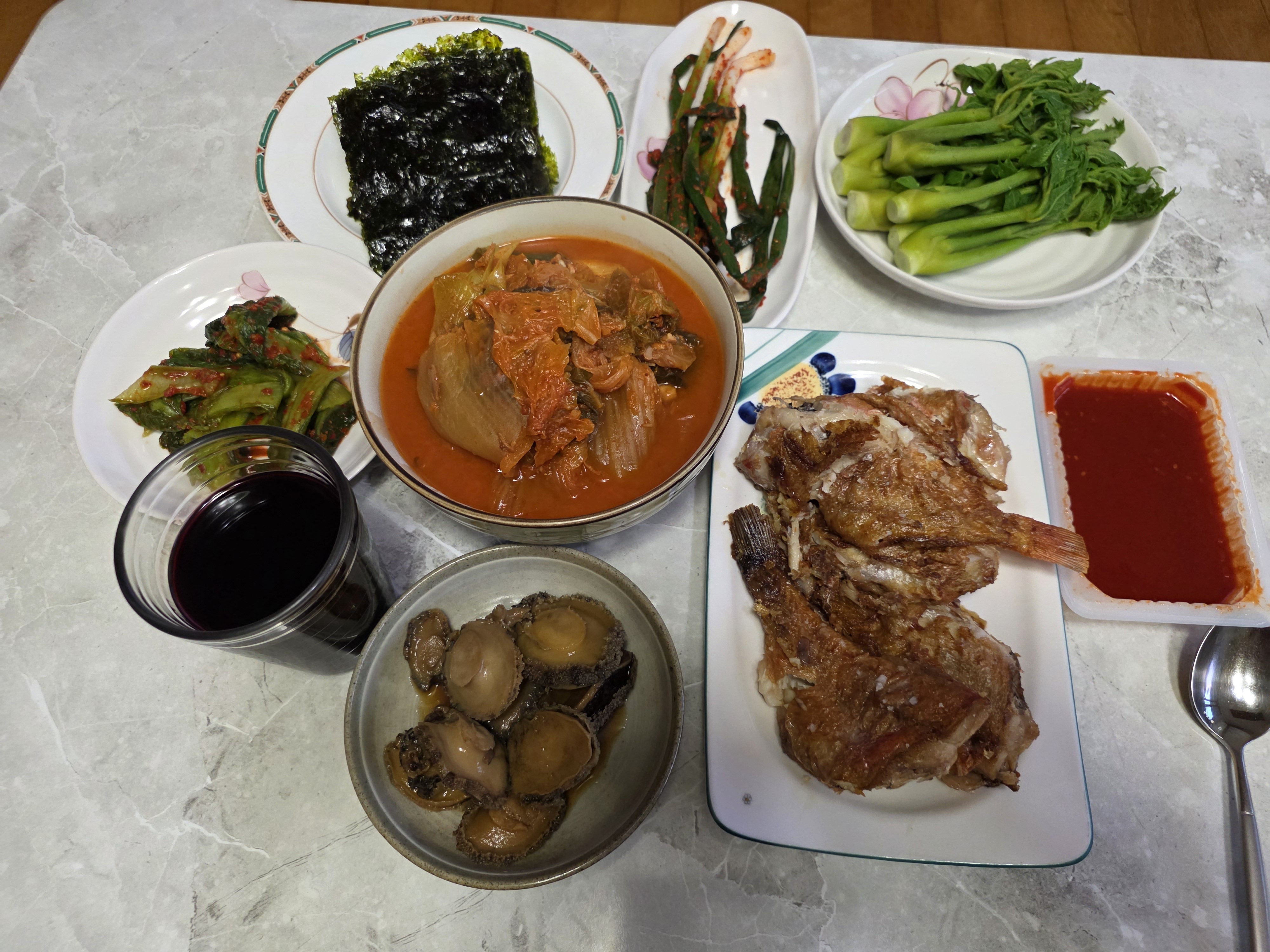 오늘집밥인데 매뉴가 엄청납니다 김치찌개 두릅 대파김치 볼락구이 전복장 갓김치등 복분자를 반주로 맛나게 먹었습니다 즐거운 금요일 되세요