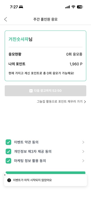 늘 환상적인 이벤트 준비해 주셔서 감사합니다.^_^현재 진행되고 있는 주간 홀인원 이벤트 응모가 안되는데 시스템 오류인가요? 응모기간은 4/22 수요일부터 5/5일까지인데..