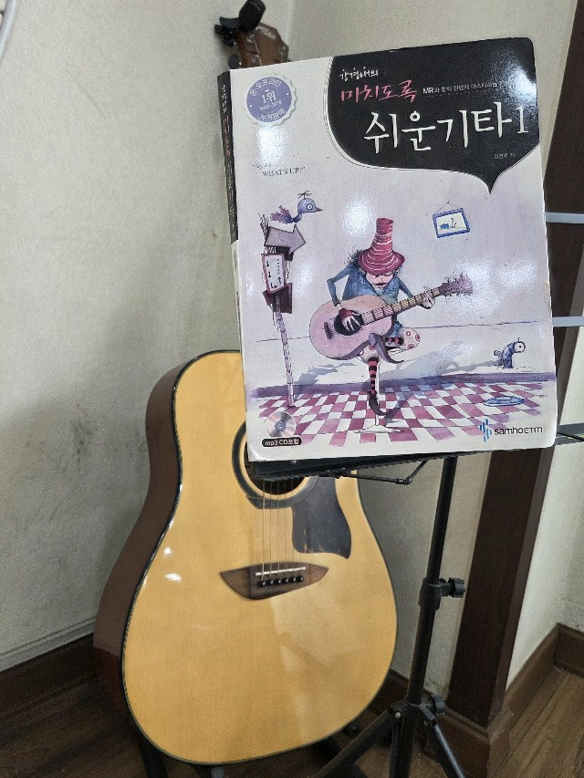 정비소 잠깐 들렸는데 기타가 있네요!함 치 볼까요~ "빠~ 빠바빠~ 빠빠빠~ 빠빠빠~ 🎶🎵아니야 뒤에 있잖아~" 우리땐 "이정선 기타교실" 이였는데강경애 기타교본 이네요 ㅋㅋ
