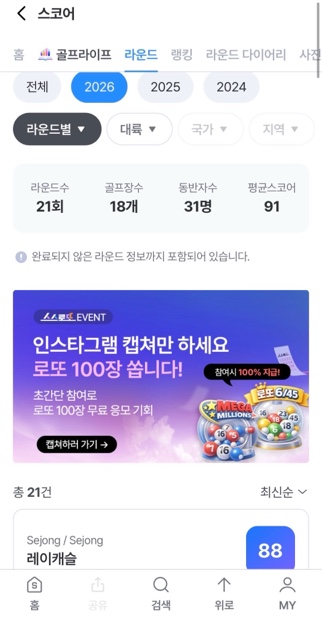 골프시작하고 라운드 후 그때의 기억을 되새기려 라운드마다 기록을하고 있습니다. 어느덧 만 2년이 다되어 가네요24년 12월 처음 머리를 올리고25년 연습하며 한번두번 지인들과 다니다가26년 본격적으로 지인만이 아닌 조인도 참여하면서 올해만 벌써 21번째 라운딩응 마쳤네요. ㅎㅎㅎㅎ올해 과연 몇번이나 나갈수 있을지진심골퍼로 열심히해서 평균 스코어내려 보겠습니다 ㅋㅋ