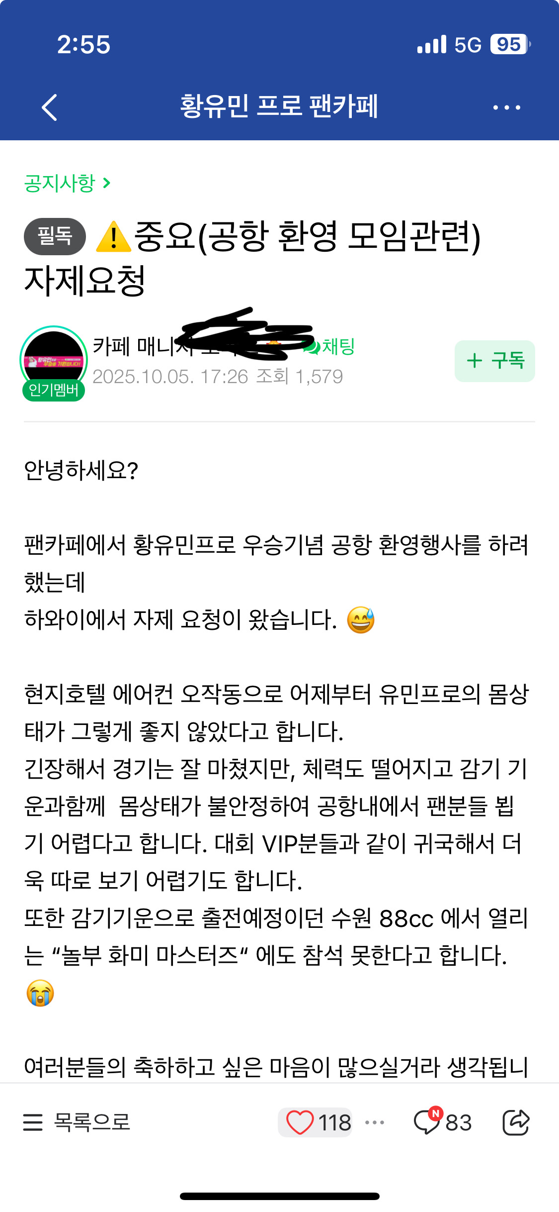 인천 공항으로 가려고 했는데… 황유민 프로님 컨디션 문제로 일정이 취소 ㅠㅠ 정말 아쉽게 되었네요. 1박2일 가족 여행 못간다고 하고~ ㅎㅎㅎ 참석 하려고 한건데. 😭😭 다음 대회까지 불참한다고 하네요. 컨디션 회복후 상상인/한경 와우넷 오픈2025 대회에서 격하게 축하할 예정입니다.^^