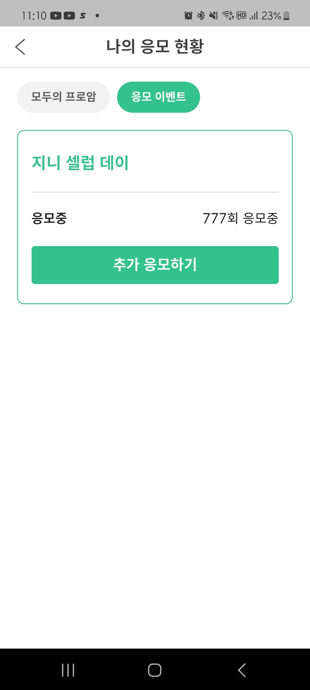 1회때 20회가 최댄줄 알고 광고도 안보고 출석도 안하고 그냥 있다가 당첨발표때 10000회보고 충격;; 2회때 몰빵하리라 열심히 하다가 안되믄 충격이 클꺼같아 주간홀인원 넣어야하나 매주고민함(고민할때마다 1004 2008엄청난분들때메 참음) 그러던중 갑자기 여러 이벤트가 떴음 선택장애처럼 고민은 극에 달함 결국 모프2는 경쟁 넘 심할거같아 분산투자 선택함 필드나가는게 우선이라 심짱님과 지니님 고민하다 심짱님 몰릴거 같아 지니님 선택 10월 내내모은거 다 넣자니 아까워 500회 넣었다가 11시에 댓글보다 1004 두분보고 올인하기로 결심 1004에 턱 없이 모지라지만 행운의 777믿고 기다려봅니다 ㅎㅎㅎ 지니님 당첨자분들 미리 축하드립니다~~같이가요ㅜㅜㅜㅜㅜㅜㅜㅜㅜ