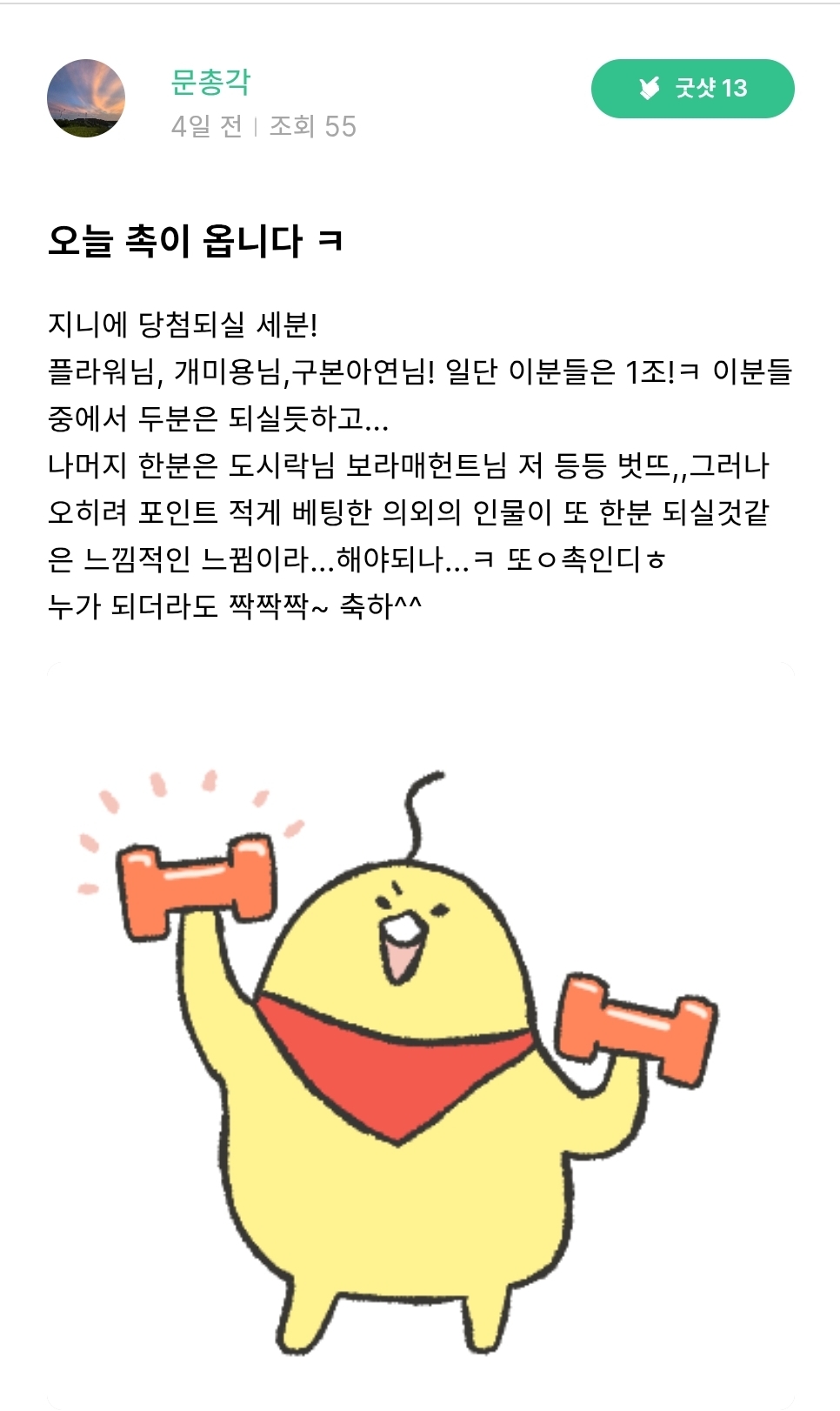 저번에 쥐니이벤트에 떵촉을 한번 세워 거의 맞췄던것처럼 재미로... 또 구찌삼아ㅋ 예상순위 한번 가겠습니다 ㅋㅋㅋ 1위, 조용필님 당첨! 2위, 까망브로님 3위,4위...는 저와 도시락님의 각축전! ㅋㅋㅋ (앗 그럼 시락님 기분 나쁠려나..엄청 장타자시던디 2백사50미터는 기본...ㅠ) 핵심 관전포인트는?? 두둥~~ 점수는 부끄러버스리 공개는 안할꺼고요, 1위 2위가 누군지만 할꺼야요 ㅋ