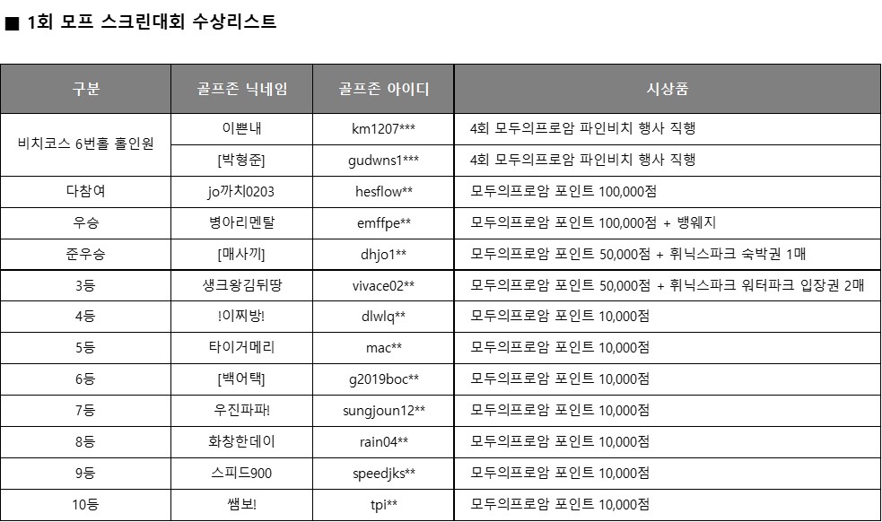 모두의프로암 운영진입니다~^^ 회원님들의 열화와 같은 성원 속에, 제1회 모프 스크린대회가 성료하였습니다. 첫 대회였지만, 많은 의미가 있었던 대회라고 여겨집니다. 무엇보다도 비치코스 6번홀 홀인원 2분이 모두 나왔다는 점은 운영진입장에서 너무 즐겁고 기쁜 일인 것 같습니다. 대회 리뷰는 다시 드리도록하고, 수상리스트를 발표하도록 하겠습니다. 본 리스트의 골프존 닉네임과 아이디입니다. 수상되신 회원분들께서는 하기 메일로 본인 인증을 위한 내용을 전달해주시기 바랍니다. ■ 모두의프로암 운영메일 help@proam.kr ■ 메일 첨부내용 1. 골프존 App MY 페이지 캡쳐 - "닉네임", "아이디"가 확인필요 2. 모두의프로암 프로필 캡쳐 - 회원님 이름, 연락처 확인필요 3. 이름 4. 연락처
