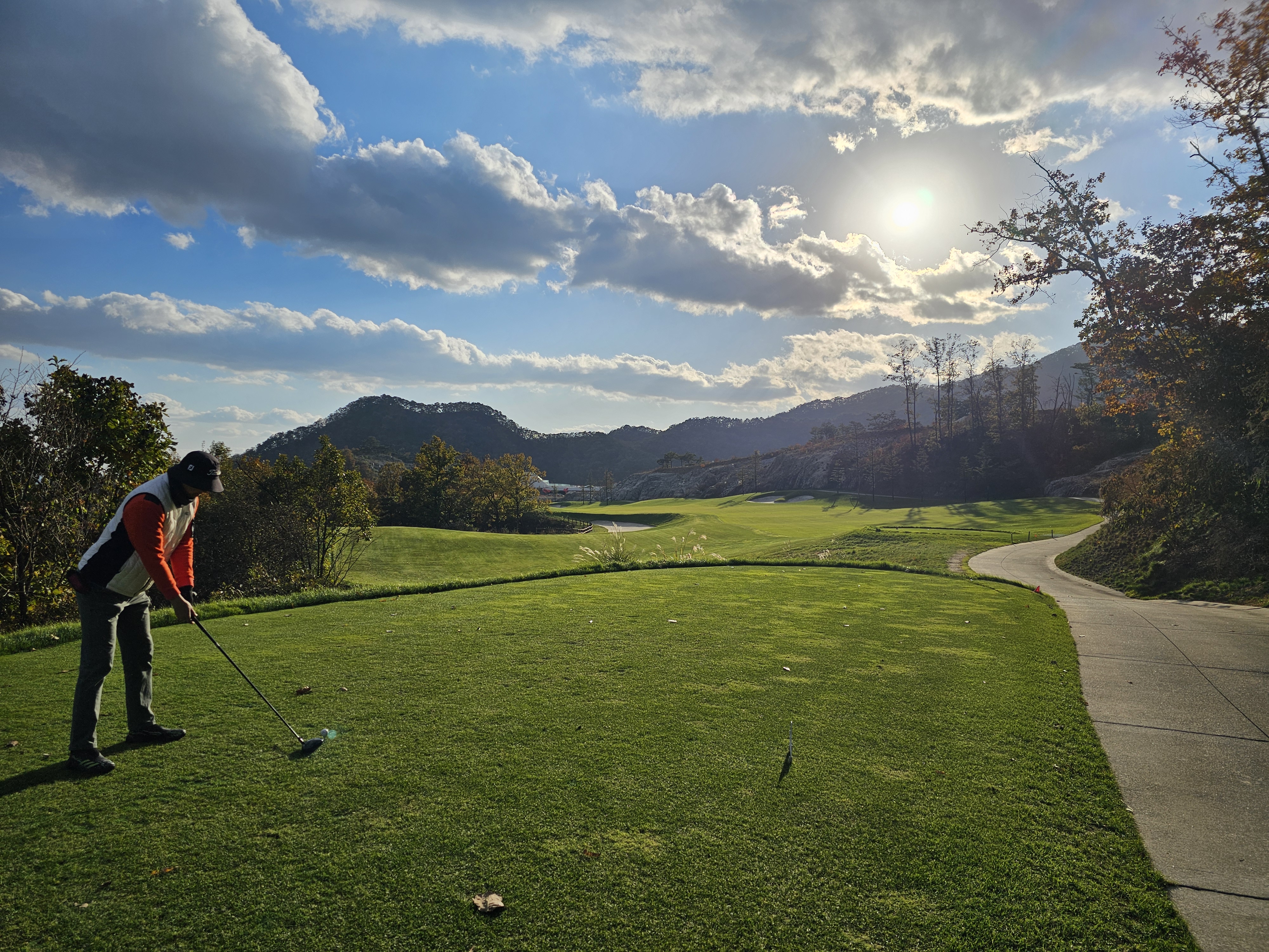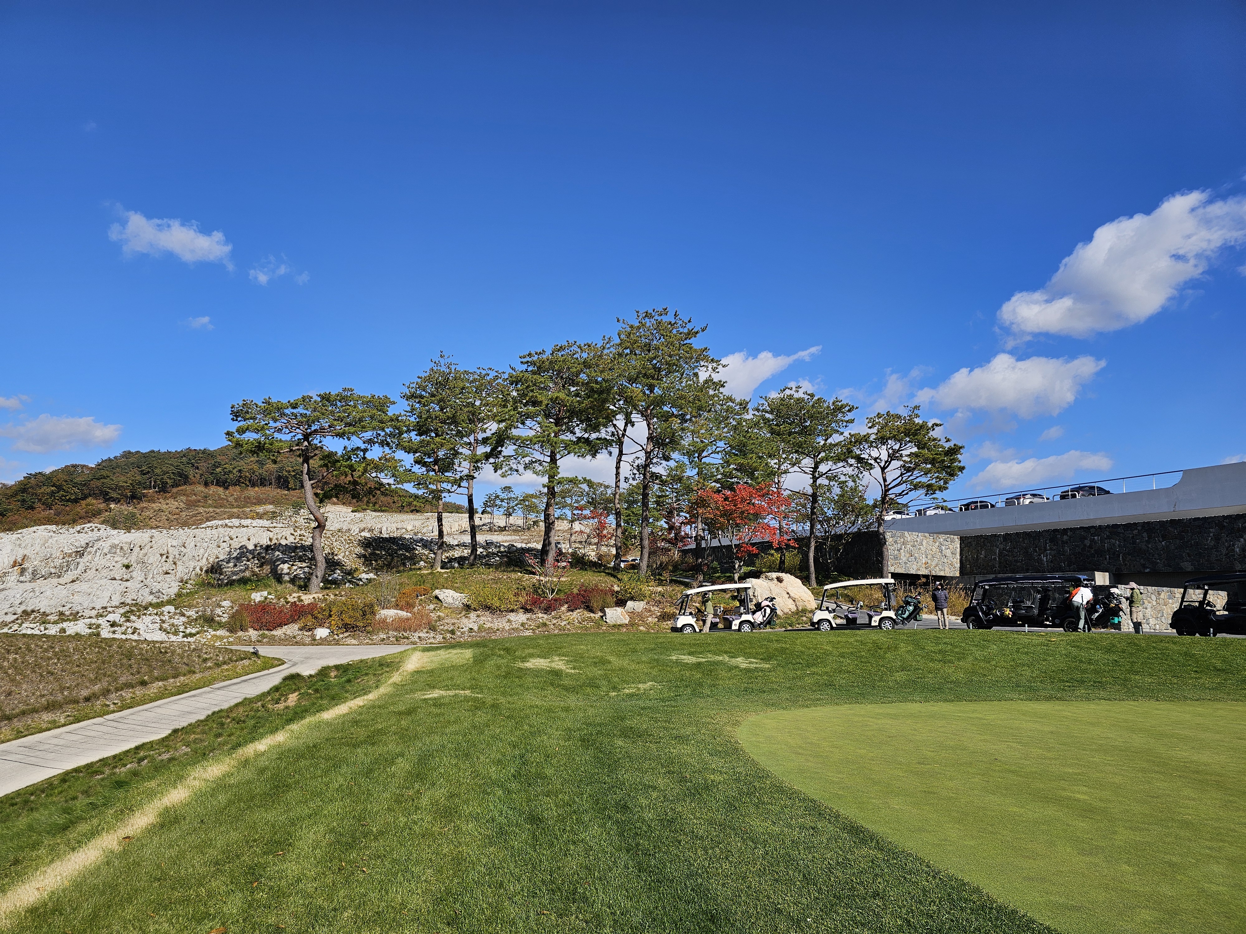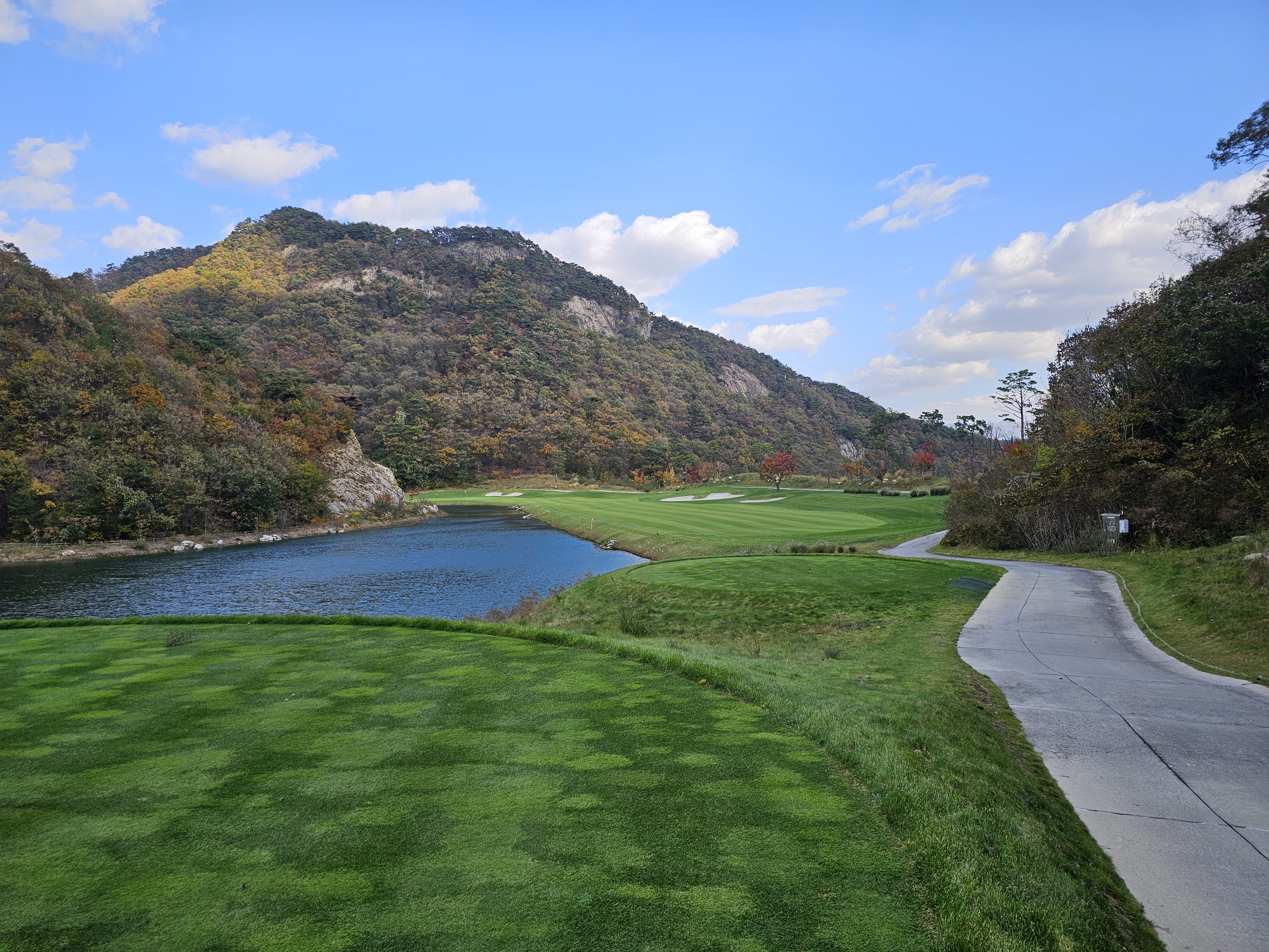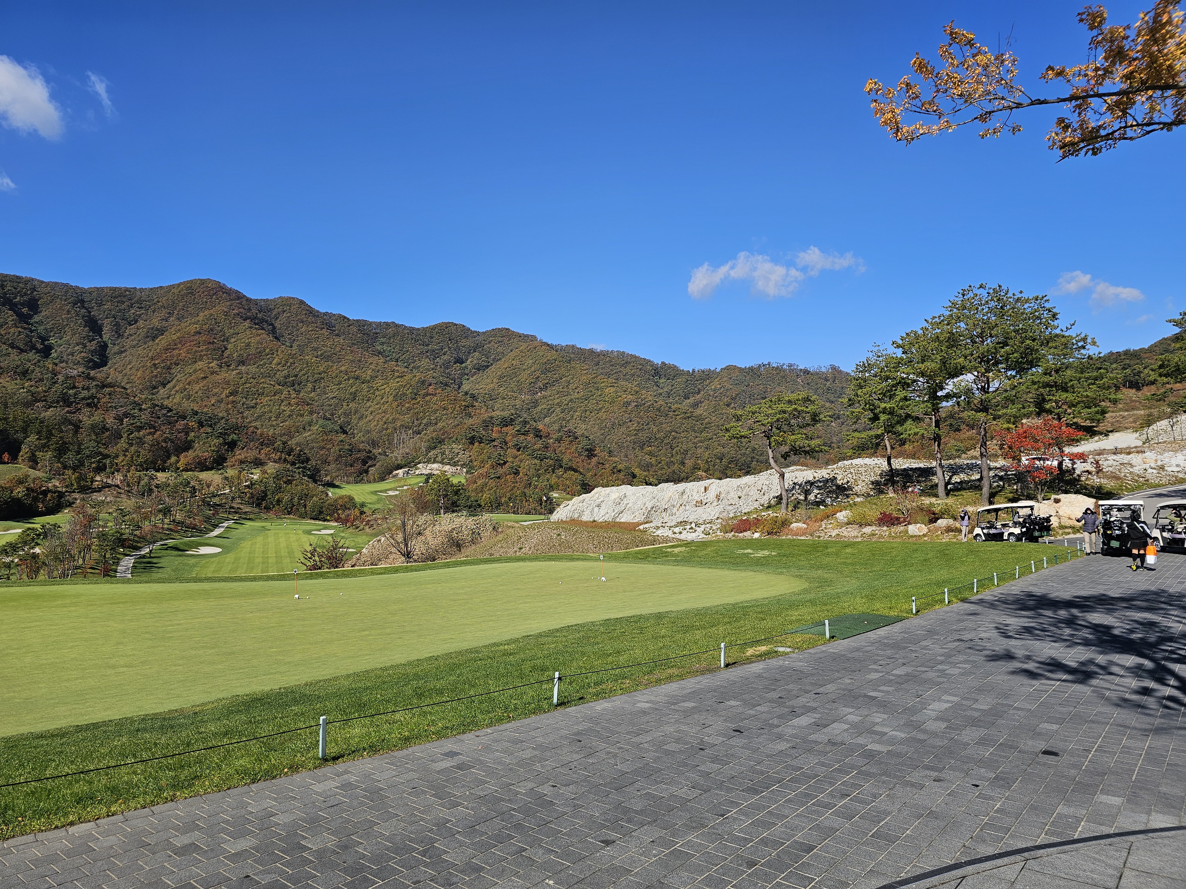3회 주간홀인원 당첨권으로 다녀온 성문안cc 후기입니다. 8월에 당첨된 주간홀인원으로 성문안으로 가을 라운드를 다녀왔습니다. 11월 2일 일요일 11:35 OUT코스 일기예보는 맑았으나 온도가 8~11도 다소 쌀쌀할 것으로 예상되었는데 햇살이 따뜻해서 그리 많이 춥지는 않았습니다. 그런데 바람이 좀 많이 불어서 골프칠 때 쉽지 않았습니다. 출발은 수원에서 8시40분 수도권제1순환도로와 광주원주고속도로를 통해 하나도 밀리지 않고 성문안 입구에 10시경 도착했습니다. 입구 바로 앞 송암 막국수에서 두부 전골로 라운드 전 식사를 했습니다. 민물새우탕이나 생태탕 같은 칼칼하고 시원한 맛이 괜찮았습니다. 갠적으로 이집 막국수는 그냥 그랬습니다. 클럽하우스로에서는 발렛으로 편하게 주차했고 스타트 하우스로 나가보니 햇살은 따뜻한데 바람이 꽤 많이 불었습니다. 그린스피드는 3.0이라 공지됐고 체감은 그것보다는 살짝 느린 2.7~2.9 사이 정도 느껴졌습니다. 엄대장님 후기에서 리무진 카트 업그레이드 내용을 보고 저도 전화로 리무진 카트로 업그레이드 했습니다. (엄대장님께 감사 드립니다.) 그래서 총 비용은 카트 업그레이드 비용 10만원으로 끝났구요. 캐디피는 별도인데 여기는 기본이 16만원이네요. 팁 주실 분들은 참고하시면 좋을 것 같습니다. 리무진 카트는 생각보다는 공간이 효율적이지 않았습니다. 옆사람과 몸이 닿지 않는 장점외에는 짐들 놓기 편하지 않았고 장신이신 분들은 타고 내리기 편하지 않고 무릎이 잘 부딪히니 조심하시는게 좋을 것 같습니다. 돈내고 편해야 하는데 그렇게 좋은 점을 느끼지 못했습니다. 성문안 골프 코스는 단조롭지 않아 재밌고 페어웨이나 그린 관리는 잘 되어 있는 편이나 조금 상해서 수리 중인 곳이 곳곳에 보였습니다. 그래도 열심히 관리하고 계시는분들을 많이 볼 수 있었습니다. 그린은 빠른 편에 미세한 굴곡이 많아 어렵게 느껴졌습니다. 주말이라 그런지 화이트 티박스를 시니어티 위치로 앞으로 당겨놓은 홀이 좀 있어서 요건 살짝 아쉬웠구요. 풍경은 말할 것이 없이 좋았고 캐디님도 친절하고 좋았습니다. 캐디님이 저희에게 진행을 재촉하진 않았지만 태블릿에 계속해서 진행을 재촉하는 메시지가 뜨는 건 좀 불편했습니다. 그렇게 4시 좀 안되서 라운드는 끝났습니다. 끝날 땐 좀 쌀쌀했는데 사우나에 야외로 오픈된 탕이 있어 몸 좀 녹일 수 있어 좋았습니다. 골프장에서 살짝 떨어진 지정갈비라는 식당에서 고기로 배 채우고 근처 커피샵에서 차 한잔하고 8시에 출발해서 영동고속도로 타고 오니 정체하는 구간 조금 있었지만 1시간 30분만에 집에 잘 도착했습니다. 이런 좋은 이벤트를 만들어 즐길 수 있게 만들어 주신 모두의 프로암 이승우 대표님과 스탭분들께 다시 한번 감사의 인사를 드리면서 후기를 마칩니다.