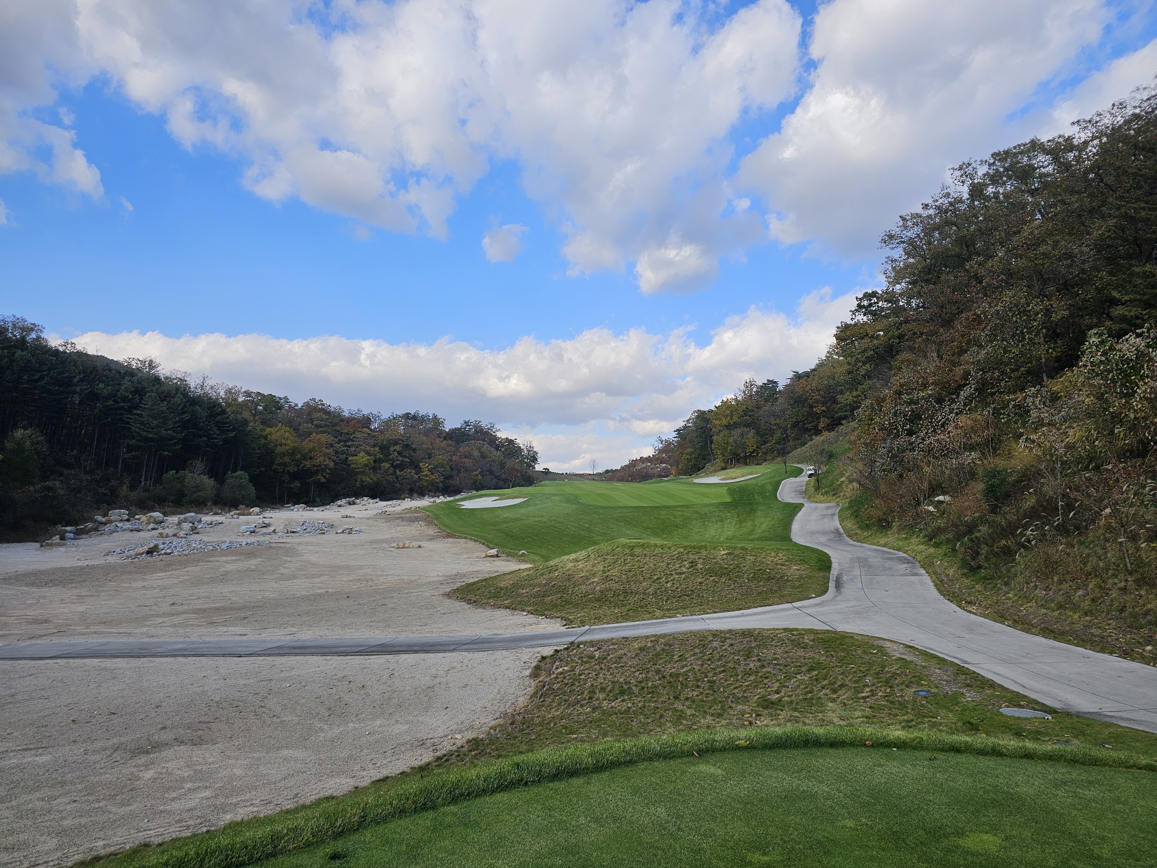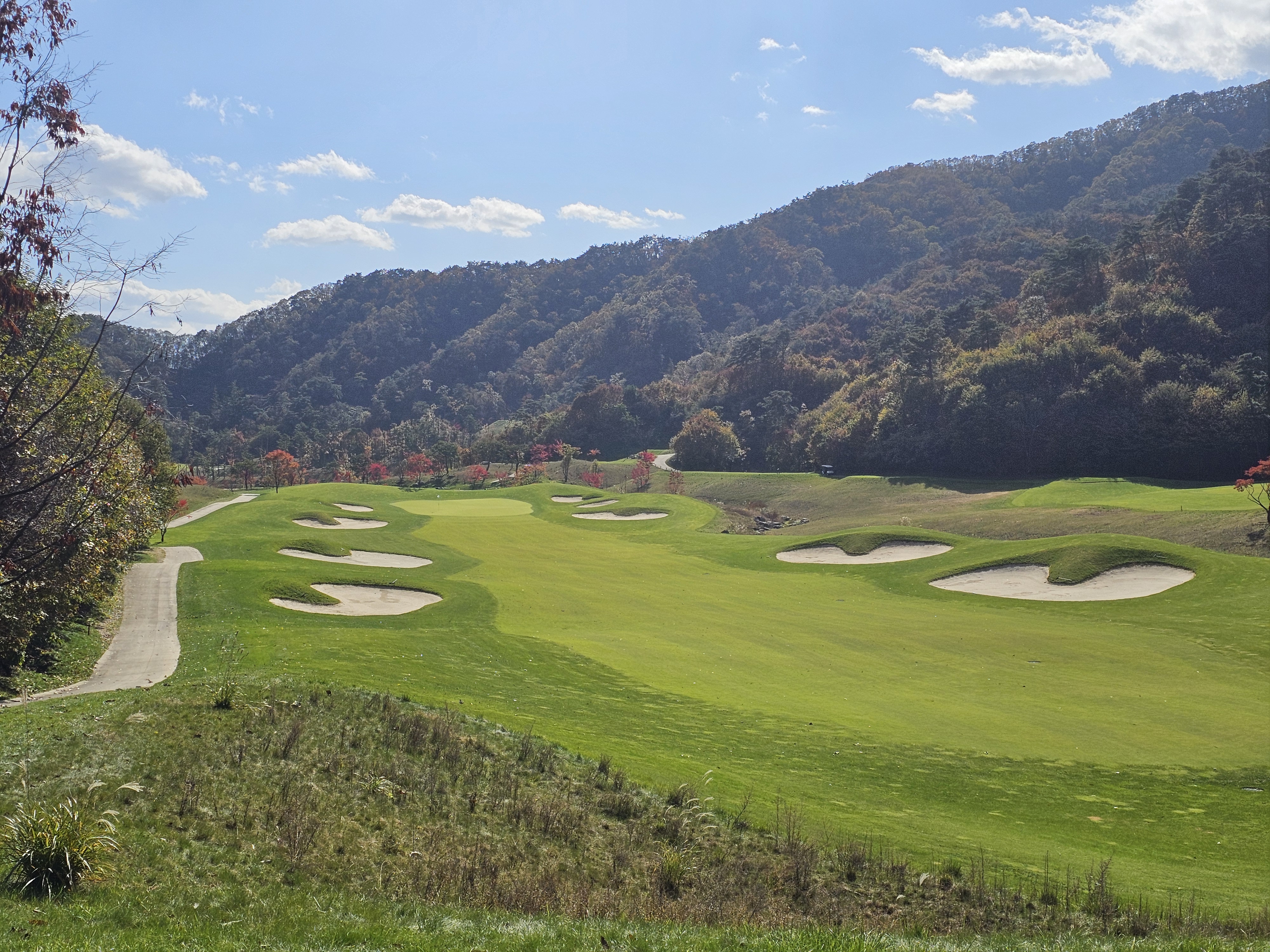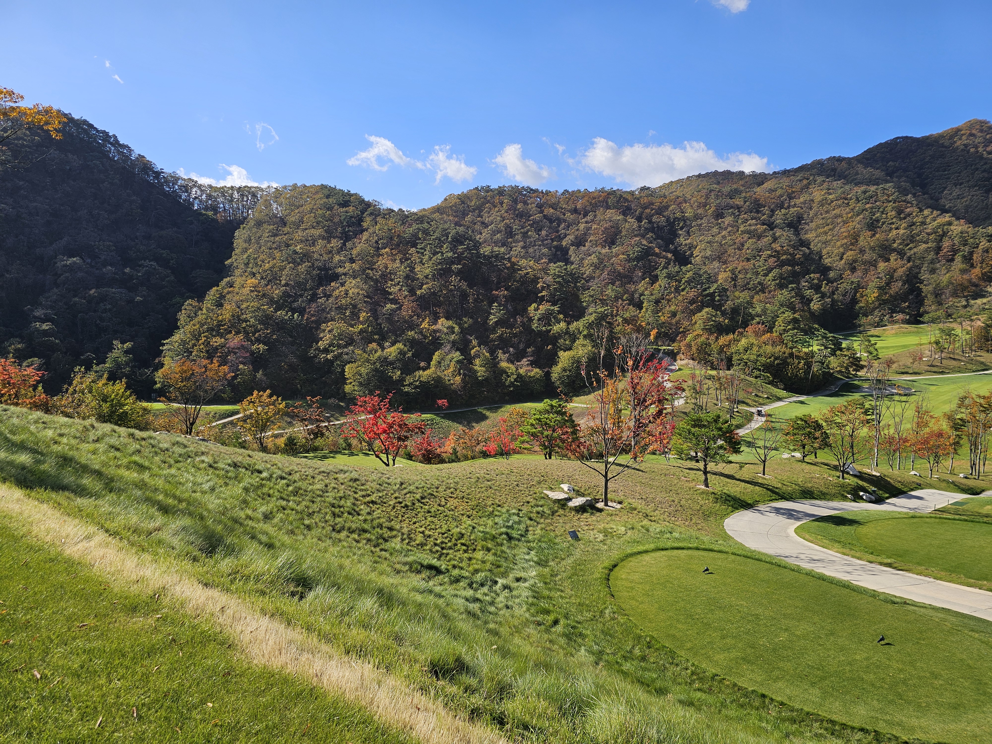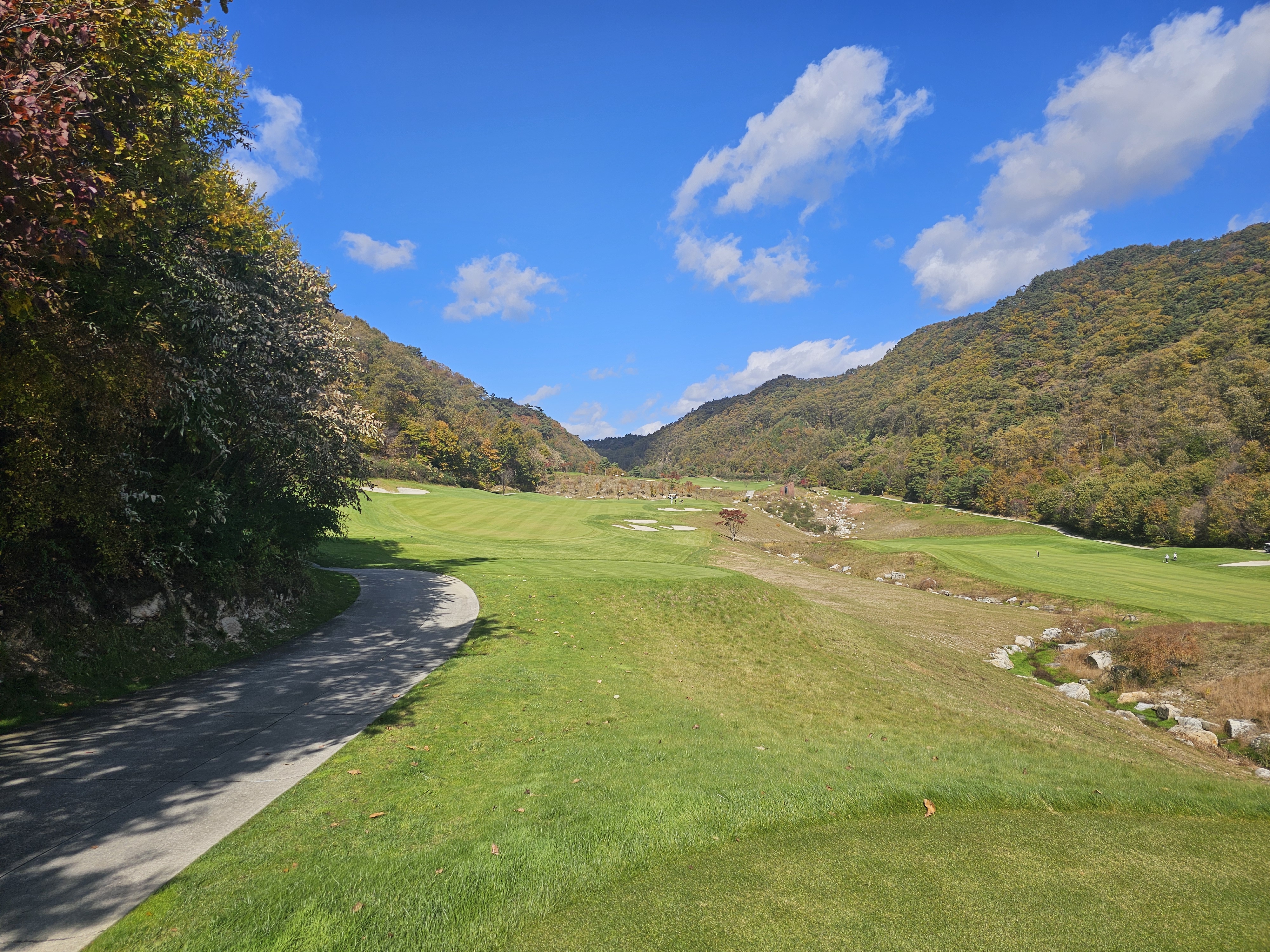 3회 주간홀인원 당첨권으로 다녀온 성문안cc 후기입니다. 8월에 당첨된 주간홀인원으로 성문안으로 가을 라운드를 다녀왔습니다. 11월 2일 일요일 11:35 OUT코스 일기예보는 맑았으나 온도가 8~11도 다소 쌀쌀할 것으로 예상되었는데 햇살이 따뜻해서 그리 많이 춥지는 않았습니다. 그런데 바람이 좀 많이 불어서 골프칠 때 쉽지 않았습니다. 출발은 수원에서 8시40분 수도권제1순환도로와 광주원주고속도로를 통해 하나도 밀리지 않고 성문안 입구에 10시경 도착했습니다. 입구 바로 앞 송암 막국수에서 두부 전골로 라운드 전 식사를 했습니다. 민물새우탕이나 생태탕 같은 칼칼하고 시원한 맛이 괜찮았습니다. 갠적으로 이집 막국수는 그냥 그랬습니다. 클럽하우스로에서는 발렛으로 편하게 주차했고 스타트 하우스로 나가보니 햇살은 따뜻한데 바람이 꽤 많이 불었습니다. 그린스피드는 3.0이라 공지됐고 체감은 그것보다는 살짝 느린 2.7~2.9 사이 정도 느껴졌습니다. 엄대장님 후기에서 리무진 카트 업그레이드 내용을 보고 저도 전화로 리무진 카트로 업그레이드 했습니다. (엄대장님께 감사 드립니다.) 그래서 총 비용은 카트 업그레이드 비용 10만원으로 끝났구요. 캐디피는 별도인데 여기는 기본이 16만원이네요. 팁 주실 분들은 참고하시면 좋을 것 같습니다. 리무진 카트는 생각보다는 공간이 효율적이지 않았습니다. 옆사람과 몸이 닿지 않는 장점외에는 짐들 놓기 편하지 않았고 장신이신 분들은 타고 내리기 편하지 않고 무릎이 잘 부딪히니 조심하시는게 좋을 것 같습니다. 돈내고 편해야 하는데 그렇게 좋은 점을 느끼지 못했습니다. 성문안 골프 코스는 단조롭지 않아 재밌고 페어웨이나 그린 관리는 잘 되어 있는 편이나 조금 상해서 수리 중인 곳이 곳곳에 보였습니다. 그래도 열심히 관리하고 계시는분들을 많이 볼 수 있었습니다. 그린은 빠른 편에 미세한 굴곡이 많아 어렵게 느껴졌습니다. 주말이라 그런지 화이트 티박스를 시니어티 위치로 앞으로 당겨놓은 홀이 좀 있어서 요건 살짝 아쉬웠구요. 풍경은 말할 것이 없이 좋았고 캐디님도 친절하고 좋았습니다. 캐디님이 저희에게 진행을 재촉하진 않았지만 태블릿에 계속해서 진행을 재촉하는 메시지가 뜨는 건 좀 불편했습니다. 그렇게 4시 좀 안되서 라운드는 끝났습니다. 끝날 땐 좀 쌀쌀했는데 사우나에 야외로 오픈된 탕이 있어 몸 좀 녹일 수 있어 좋았습니다. 골프장에서 살짝 떨어진 지정갈비라는 식당에서 고기로 배 채우고 근처 커피샵에서 차 한잔하고 8시에 출발해서 영동고속도로 타고 오니 정체하는 구간 조금 있었지만 1시간 30분만에 집에 잘 도착했습니다. 이런 좋은 이벤트를 만들어 즐길 수 있게 만들어 주신 모두의 프로암 이승우 대표님과 스탭분들께 다시 한번 감사의 인사를 드리면서 후기를 마칩니다.