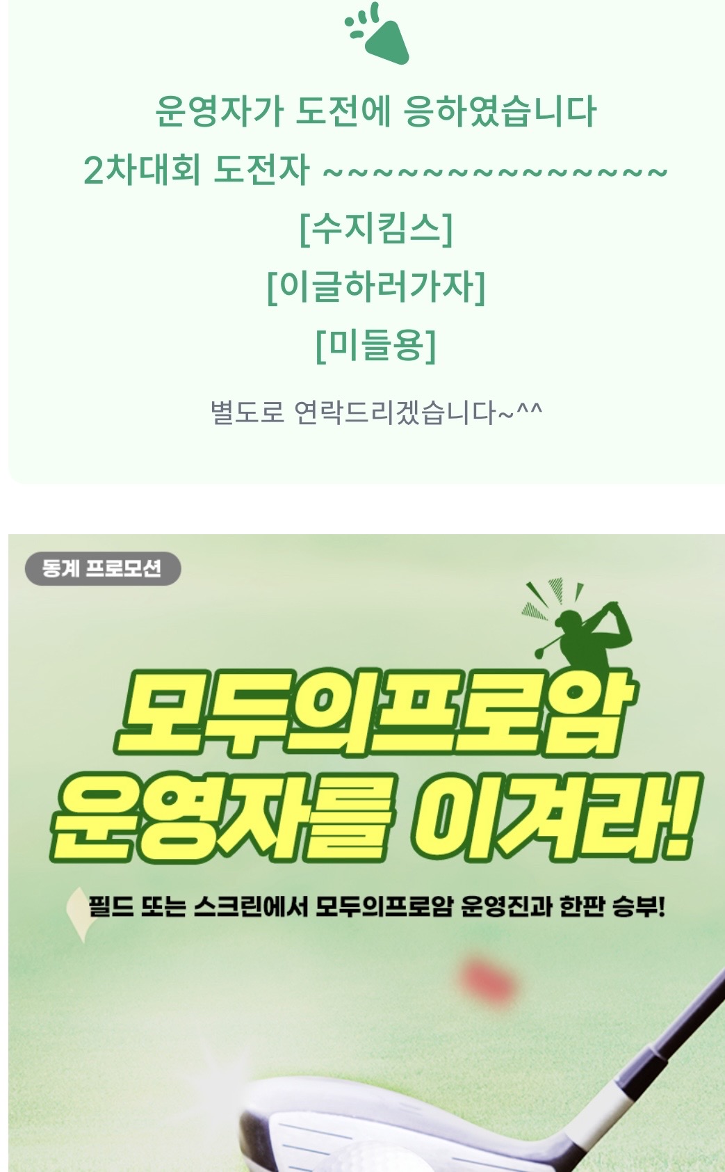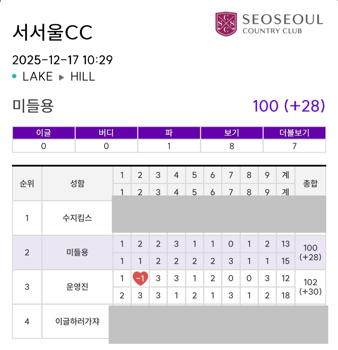 안녕하세요 미들용입니다! 모두의프로암에 가입한지 얼마 안됐는데 행운이 찾아왔네요! 사실 이게 뭔지도 잘 모르고 그냥 응모하면 되는 건가? 싶어서 몇 번 응모를 했는데 당첨이 됐더라고요? 당첨 된 것도 전화를 받고 알았어요…ㅎㅎ 일 하고 있는데 모르는 번*** 전화가 걸려와서는 뭐가 당첨됐다는데 바빠서 아, 예예하고 통화를 끊고 몇 시간 후에 어플을 확인해보니 당첨자 명단에 닉네임이!! 그렇게 당첨자 분들과 톡방에 모여 이야기를 하는데 다행이도 운영자분이 맞춤핸디의 선수를 뽑아서 보내주신다며 백돌이인 저를 안심시켜 주셨습니다ㅎㅎ 구장은 서서울cc 티업시간은 10:29 (구장 선택에 배려해주신 운영진과 함께 당첨되신 분들 다시 한번 감사드립니다.) 잔디만 밟아도 좋은 구력2년차! 즐거운 마음으로 티업 시간 보다 1시간 이른 시간에 모여서 식사를하고 구장으로 이동했는데 생각보다 안추워서 놀랬어요ㅎㅎ 그렇게 플레이는 시작되고 분명 백돌이라고 하셨던 운영진님이 2홀에 버디를 해버리셨네요?! 분위기는 전반 끝나고 스마트 스코어 핸디 공개를 촉구하며 웃으면서 재밌게 전반을 마무리 했습니다ㅎㅎ 참고로 전 구력 2년차에 필드 버디는 1회 해 본….찐찐…찐!! 백돌이입니다^^ 그렇게 전반을 마무리하고 스코어를 봤더니 1타 뒤지고 있는 스코어를(+13,12) 확인하고 어? 이거 잘하면 이길 수….도? 있겠는데? 라베도 가능하겠는데?! 라는 꿈을 꾸며 후반에 돌입했지만…….ㅎㅎㅎㅎ 퍼팅이 급격히 흔들리며 라베는 물 건너갔고 운영진님만 이기자는 생각으로 운영진님 스코어까지 철저하게 복기하며 빠짐없이 체크한 결과!! 마지막 짜릿한 역전 승을 했습니다ㅎㅎ 운영자를 이겨라 승리!! 다음 백돌이 들어오시죠ㅎㅎㅎ 즐거운 라운딩 자리를 마련해주신 모두의 프로암 운영자님 감사합니다!! 고수도 즐길 수 있고! 백돌이도 즐길 수 있는 모두의 프로암 화이팅입니다!👍