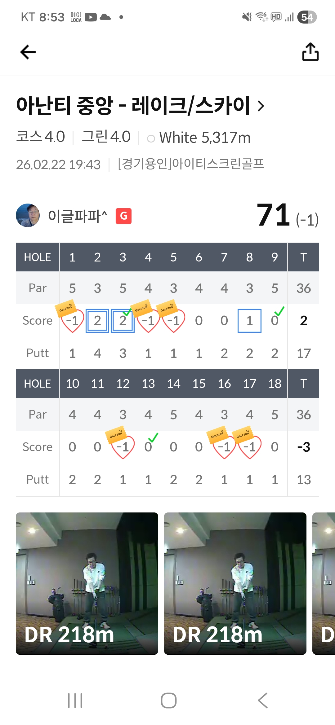 337번째 스크린 아난타에서 방금 71타로 아쉽지만 마무리 합니다. 푹들 쉬시고 내일 또 직장으로 고고싱^^