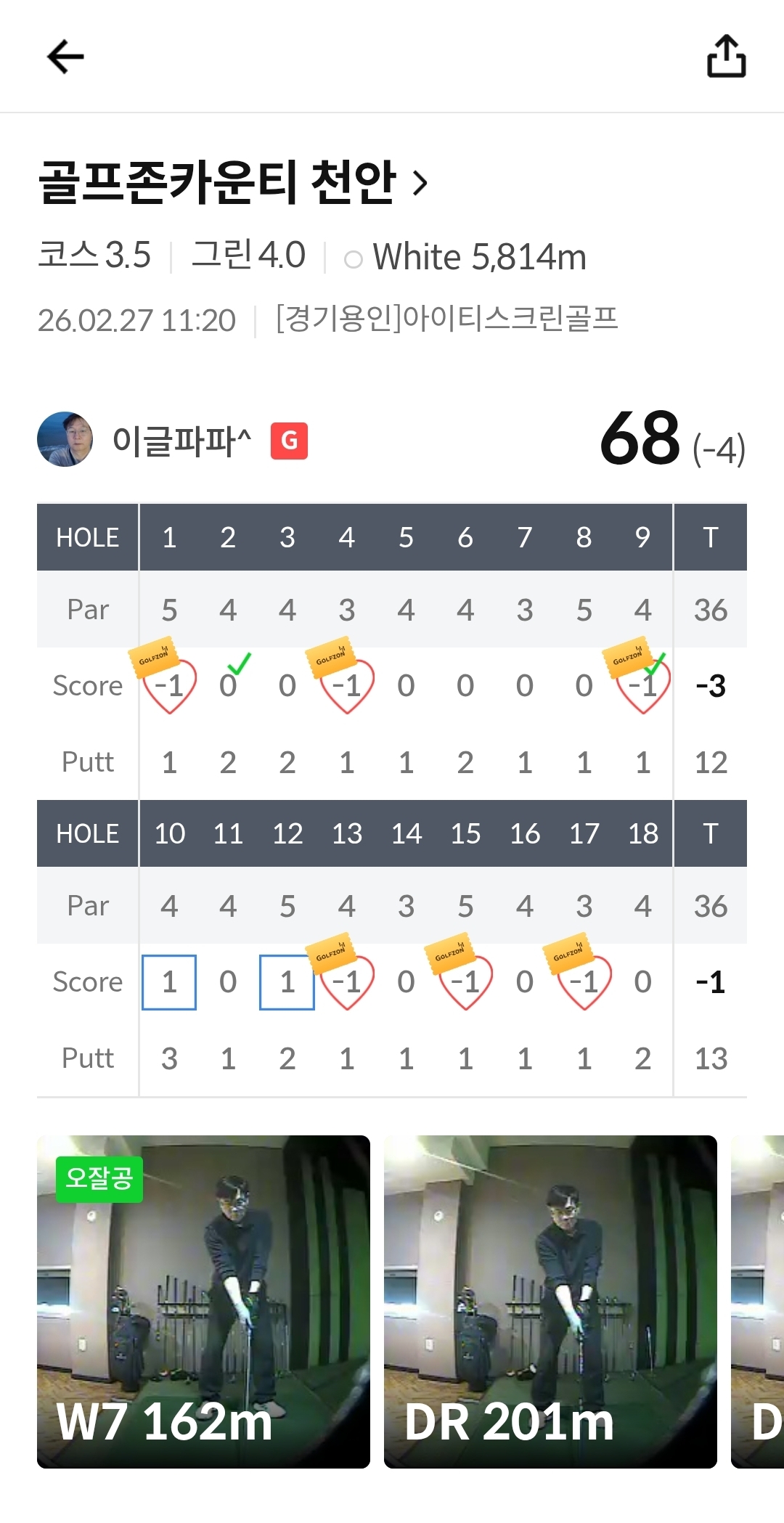 3월4일 골프존천안 9시30분 티업이라 오늘 스크린에서 1게임 쳤는데 68타 기록 필드에서도 잘 쳐야될텐데~