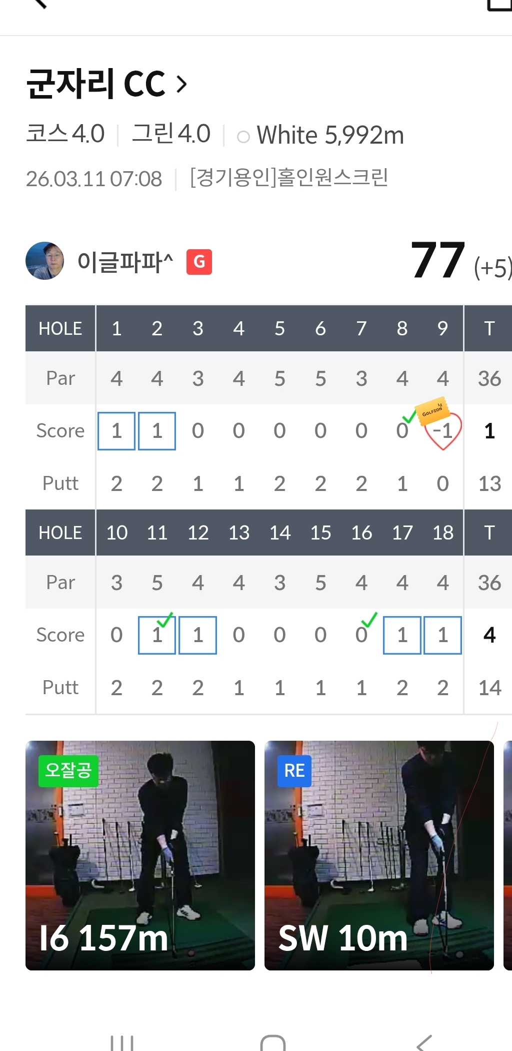 그 어렵다는 군자리CC에서 모처럼 싱글쳤네요 오늘 벙개 모두 화이팅입니다 👍 👍 👍