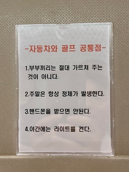 어느 스크린 화장실에 붙어 있는 문구입니다. 자동차와 골프 공통점 1. 부부끼리는 절대 가르쳐 주는 것이 아니다. 2. 주말은 항상 정체가 발생한다. 3. 핸드폰을 받으면 안된다. 4. 야간에는 라이트를 켠다.