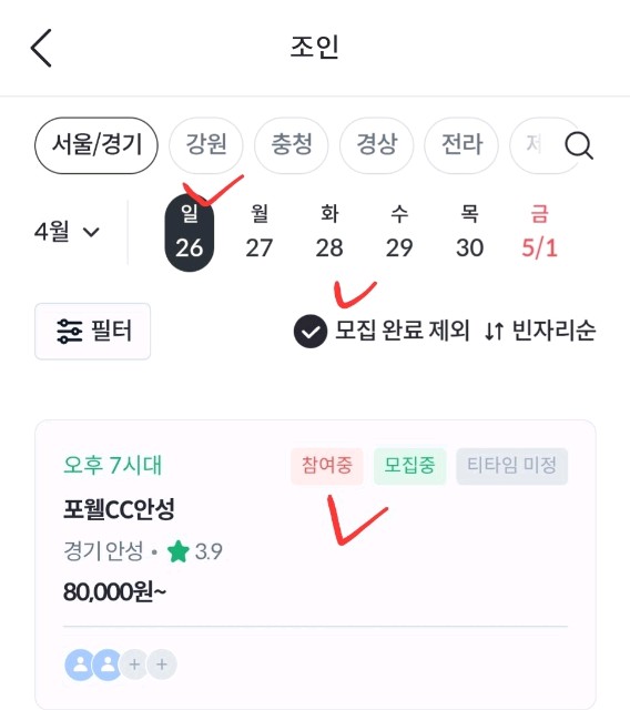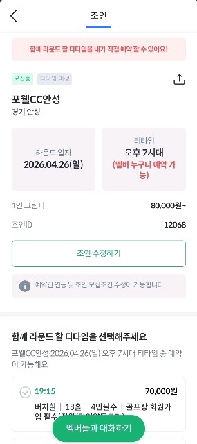 카카오조인이벤트 참여 하실 용자님 모집(4.26일 야간7시대)카스카디아 행운🍀 이 함께하길 기도합니다. 😀일시 4.26일 당일 7시대장소 포웰CC안성모집인원 2명그린피7 카트2.5 캐디피3https://www.kakao.golf/join/detail/12068