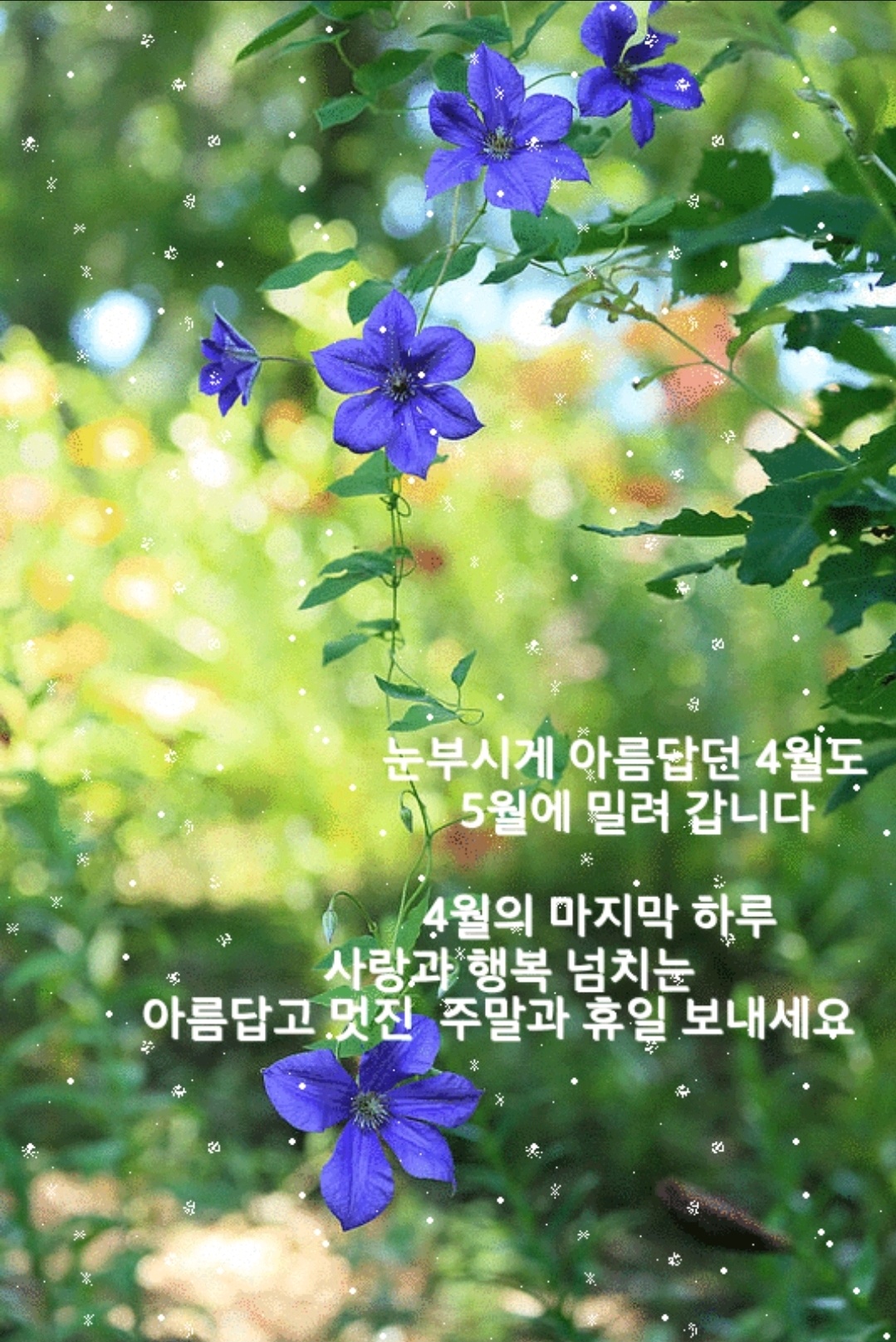 꽃잎들이 휘날리며 향기를 나르던 4월의마지막날 한달동안 수고많으셨습니다 새로이 맞이하는 5월은 꿀맛같은 연휴로시작하는군요 오늘하루 마무리 잘하시고즐거운 5월 맞이하세요 🤗