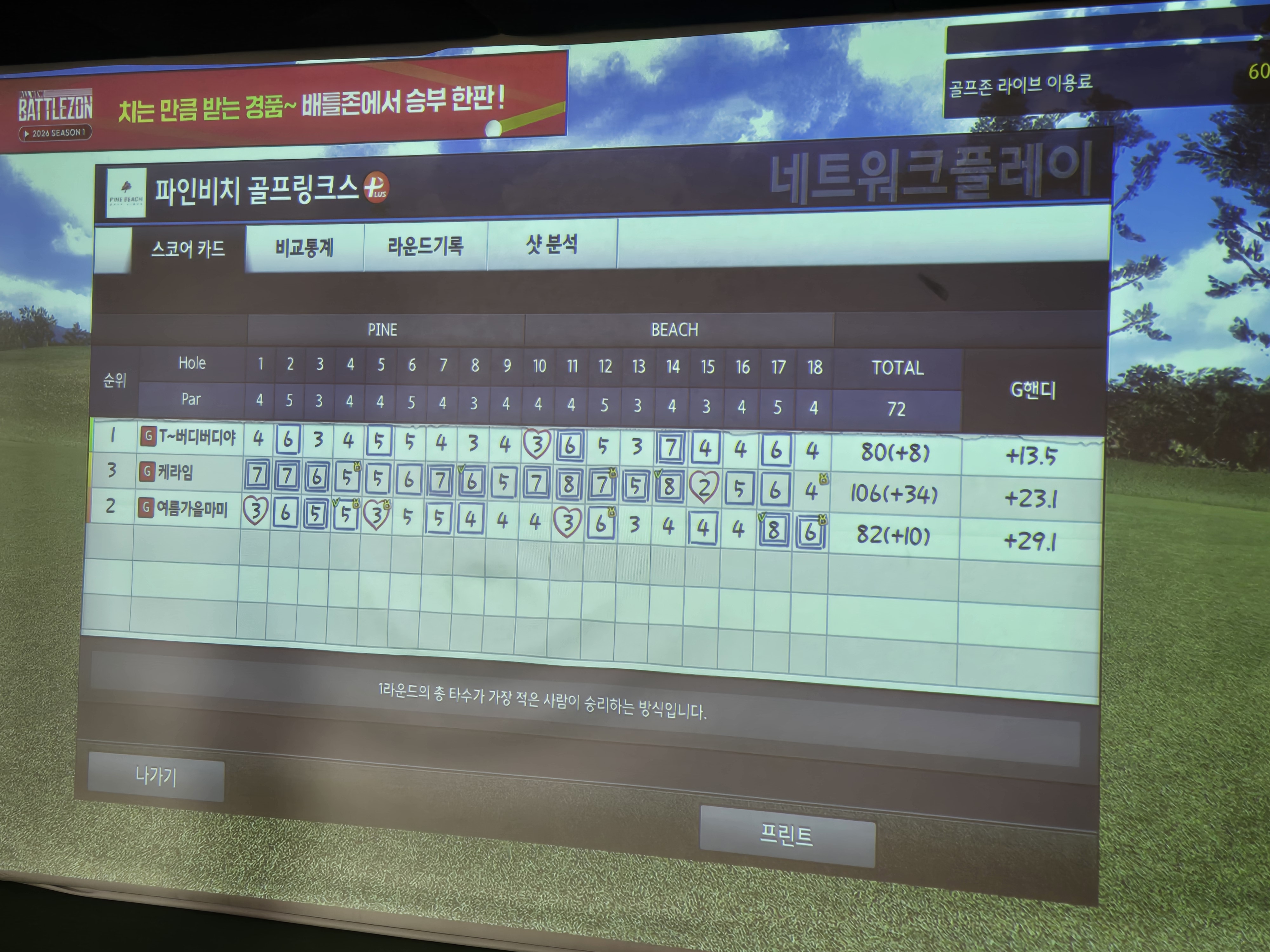 여기 영남방서 야그할께예~ 자유엔 인자 시끌시끌 할끼고 좀 남부끄러버가:: 6명중 제가 1등 했슴다^^ 6만원 땄스예~~ 스크린 거 뭐시라꼬ㅋㅋ